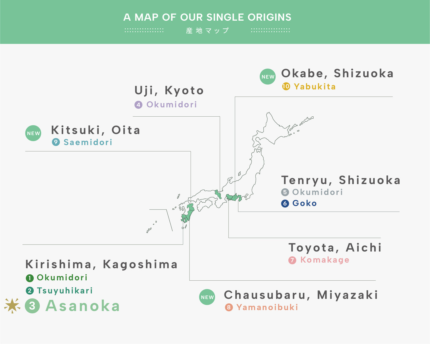 「あさのか」は霧島地方の豊富な日光を好む、鹿児島県を代表する品種の1つで、旨みの元となるアミノ酸が豊富に含まれています。甘く爽やかな香り、軽い口当たりとほのかな渋みが、繊細さを引き立てています。