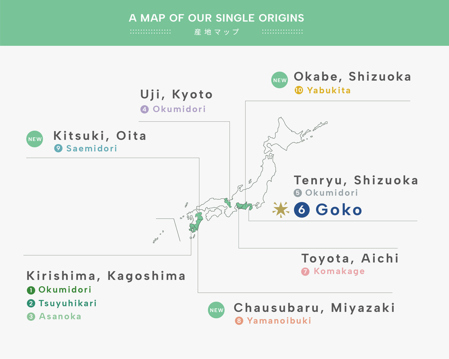 日本のお茶には100種類を超える品種があります。また同じ品種でも、産地の違いや生産者の独自の技術により、味や香りは大きく異なります。その多様で個性豊かな味わいを飲み比べながら、自分好みの味わいを見つけだすことがシングルオリジンの最大の魅力です。ぜひそれぞれの茶葉がもつシングルオリジン抹茶の個性をお楽しみください。