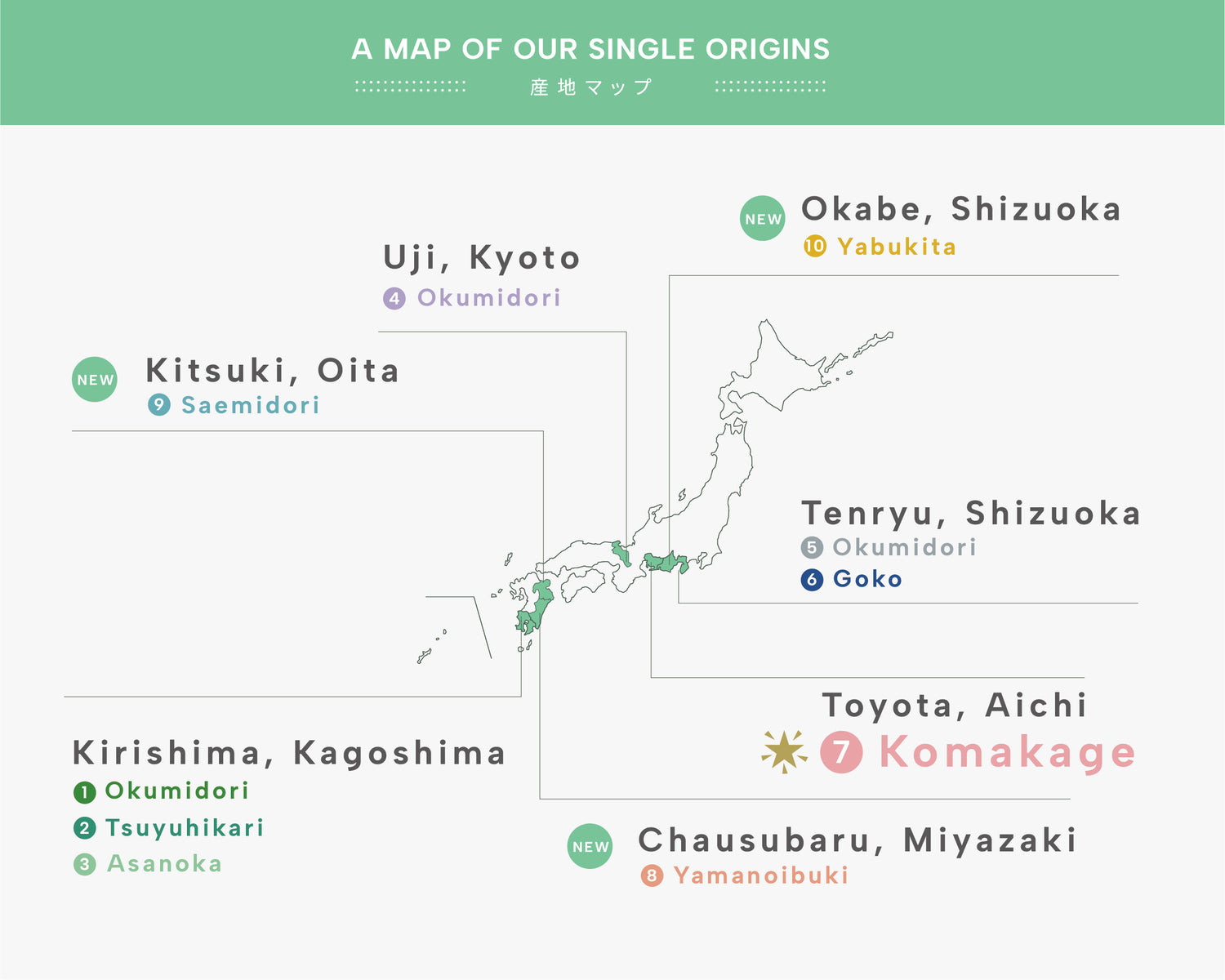 日本のお茶には100種類を超える品種があります。また同じ品種でも、産地の違いや生産者の独自の技術により、味や香りは大きく異なります。その多様で個性豊かな味わいを飲み比べながら、自分好みの味わいを見つけだすことがシングルオリジンの最大の魅力です。ぜひそれぞれの茶葉がもつシングルオリジン抹茶の個性をお楽しみください。